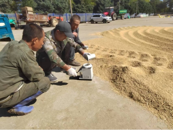 在勤得利农场各粮食晒场,农技人员手持便携式粮食水分测定仪,现场为栽培户检测稻谷水分含量。仅需数分钟,仪器即可精准显现数据。农技人员结合检测成果,向农户解说水分超支损害及暴晒技巧,协助其把握科学暴晒规范,防止因水分把控禁绝导致粮食霉变丢失。